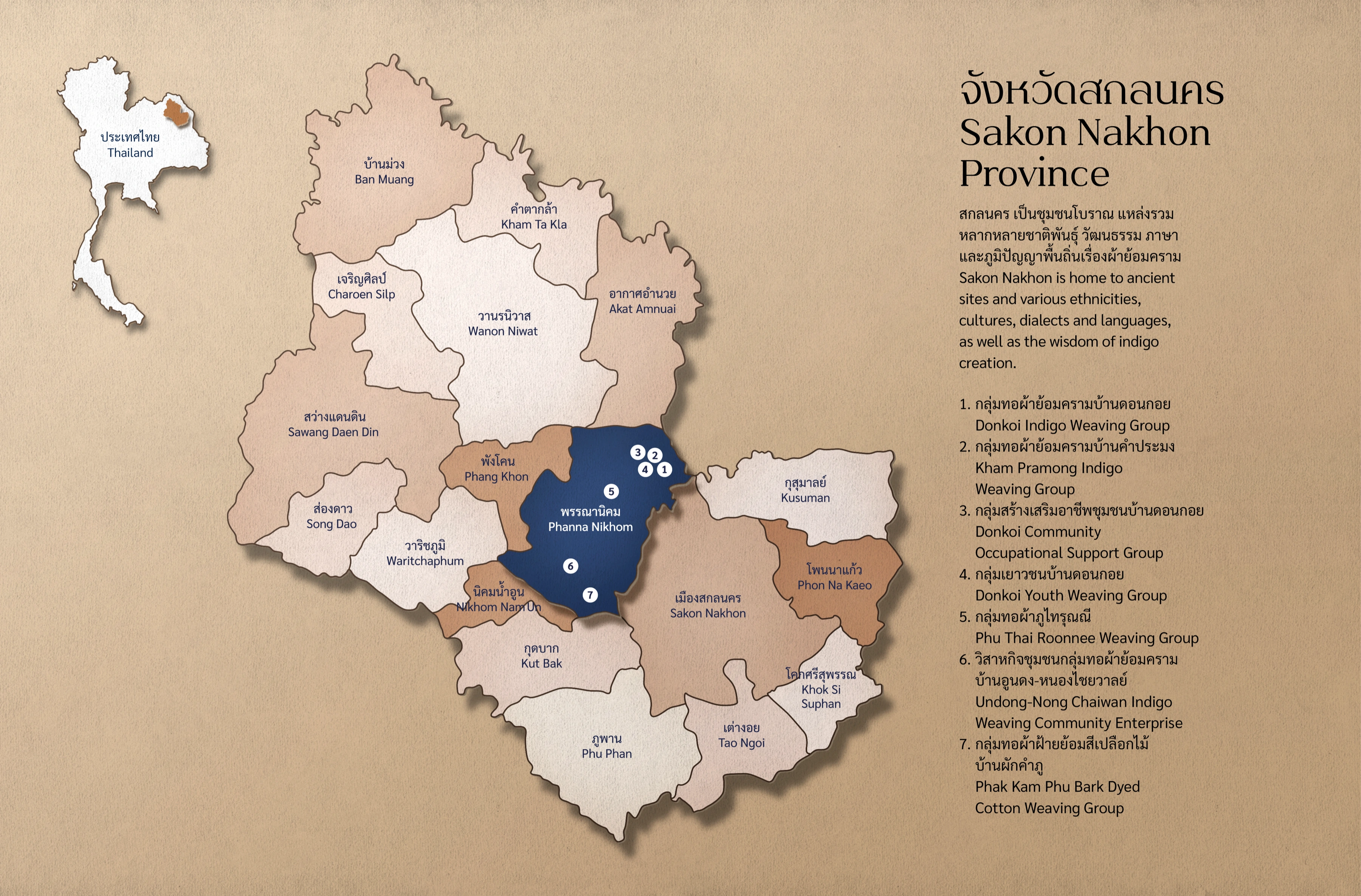 สมเด็จพระเจ้าลูกเธอ เจ้าฟ้าสิริวัณณวรี นารีรัตนราชกัญญา เสด็จไปยังกลุ่มทอผ้าย้อมครามบ้านดอนกอย อำเภอพรรณานิคม จังหวัดสกลนคร เพื่อทรงเยี่ยมกลุ่มทอผ้า และทอดพระเนตรขั้นตอนการผลิตผ้าย้อมครามที่เกิดจากภูมิปัญญาพื้นถิ่นทางด้านการทอผ้าย้อมครามจากวัสดุธรรมชาติ พระองค์มีพระวินิจฉัยและพระราชทานคำแนะนำให้ย้อมในโทนสีที่อ่อนลง เพื่อให้มีความร่วมสมัยและเป็นสากล ทรงสนับสนุนให้นำผ้าย้อมครามไปแปรรูปเป็นผลิตภัณฑ์ที่หลากหลาย เป็นการยกระดับภูมิปัญญาพื้นถิ่นให้เป็นที่ต้องการของตลาดสากล นำมาซึ่งการสร้างงาน สร้างรายได้ให้แก่สมาชิกชุมชน สร้างชีวิตความเป็นอยู่ที่ดีอย่างมั่นคงและยั่งยืน