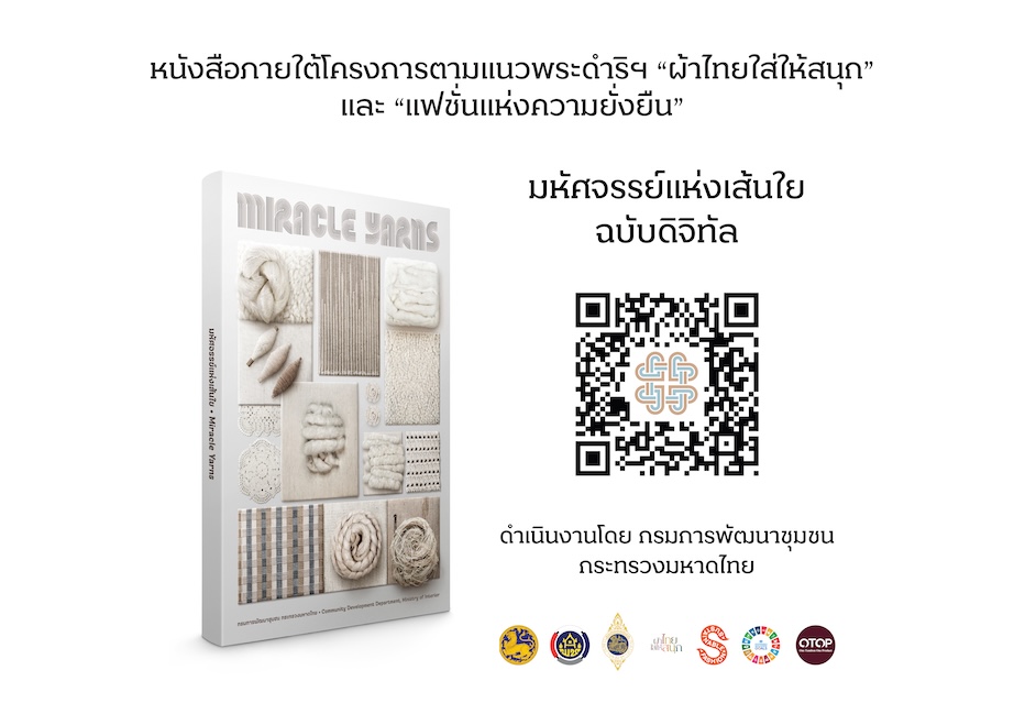 ด้วยภารกิจในการขับเคลื่อนผืนผ้าและหัตถกรรมไทยให้ก้าวสู่การเป็นแฟชั่นแห่งความยั่งยืน ยกระดับเป็นอุตสาหกรรมสร้างสรรค์ที่ทรงพลัง สอดรับกับทิศทางการพัฒนาประเทศ และนำไปสู่การพัฒนาคุณภาพชีวิตที่ดีให้แก่ประชาชนได้อย่างแท้จริง กรมการพัฒนาชุมชน กระทรวงมหาดไทย หวังเป็นอย่างยิ่งว่า หนังสือ “มหัศจรรย์แห่งเส้นใย : Miracle Yarns” เล่มนี้ จะเป็นอีกหนึ่งพลังขับเคลื่อนในการเผยแพร่ภูมิปัญญาไทย เสริมสร้างมูลค่าให้แก่ผลิตภัณฑ์ชุมชน สร้างงาน สร้างรายได้ และยกระดับเศรษฐกิจฐานรากอย่างยั่งยืน